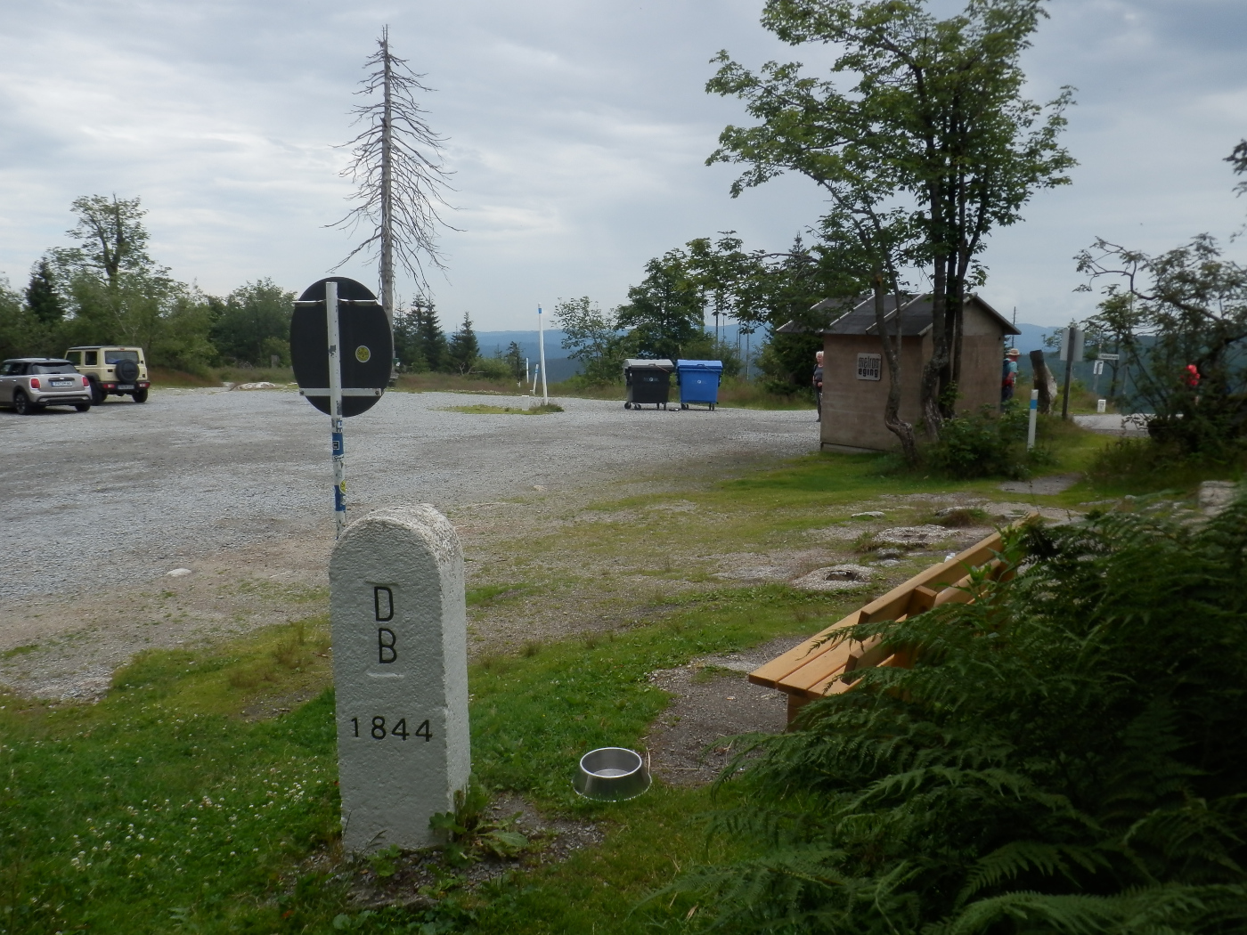Nein, ein schmaler, zu einem spitzen Dreieck zusammenlaufender und von allen Besuchern geflissentlich ignorierter Streifen Land quer über den Parkplatz vor dem Schutzhaus bis fast hin zum Gipfelfelsen ist tschechisches Staatsgebiet. Um vom Hochkammweg oder der Autostraße zum Schutzhaus zu gelangen, muss man einige Meter Transit durch unser gemeinsames Nachbarland auf sich nehmen. Bei meinem Besuch standen vorallem Mistkübel und eine nicht näher öffentlich nutzbare Holzhütte in diesem Streifen Tschechiens. Ob damit etwas gesagt werden soll? Vermutlich nicht, aber konnten Wanderer diese kleine Grenzanomalie zu Zeiten des eisernen Vorhanges auch so entspannt nehmen?